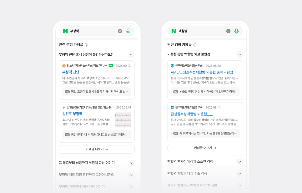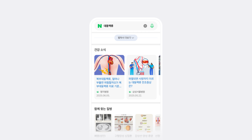 이번에 선보이는 건강검색서비스는 이런 불편을 해소하기 위해, AI가 요약한 질병정보, 공신력 있는 건강소식과 환자·보호자 경험담을 한눈에 확인할 수 있도록 구성했습니다.